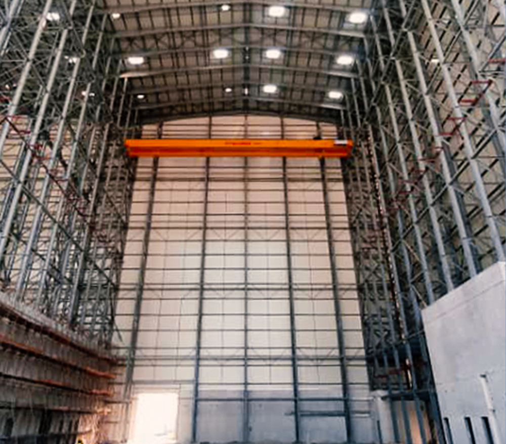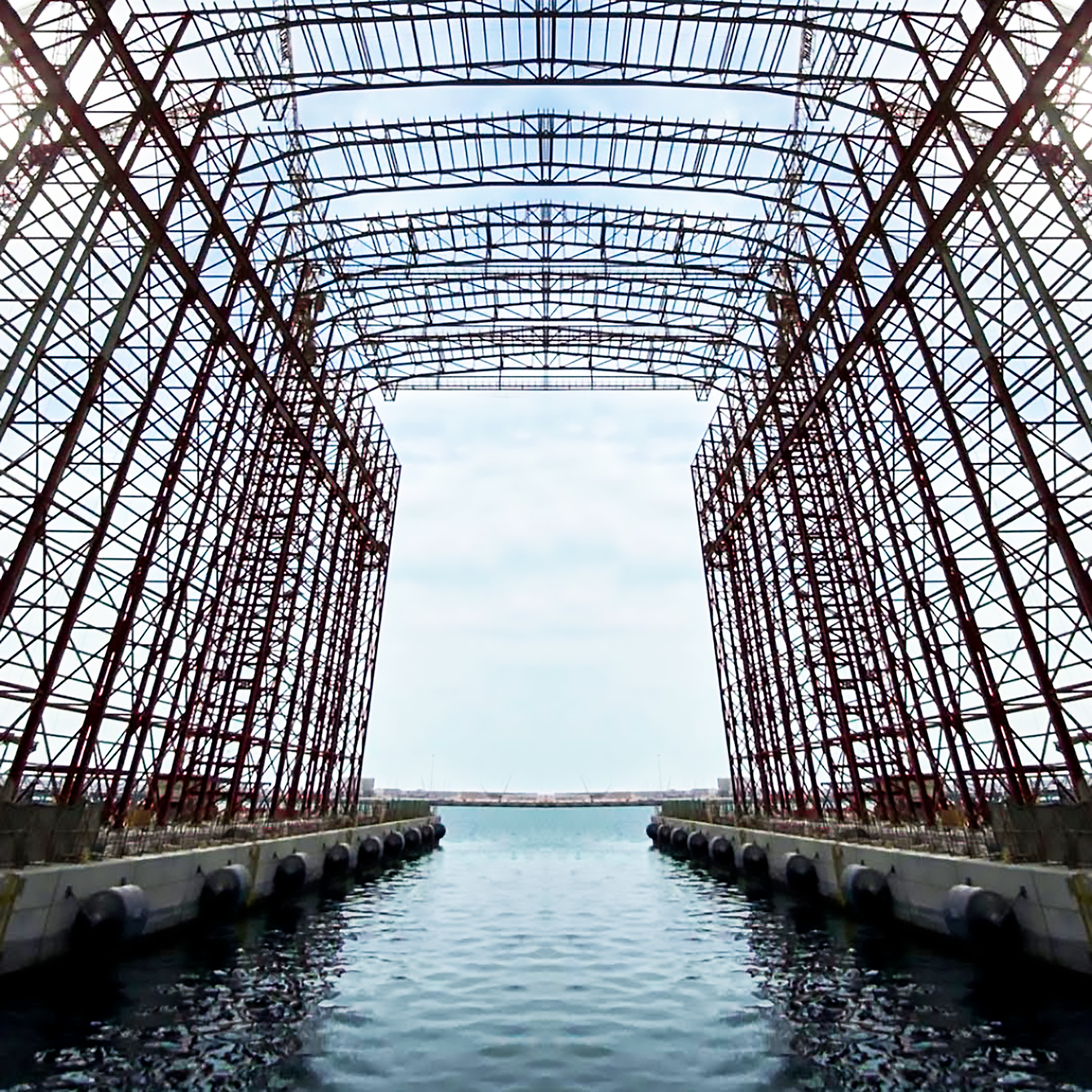 Two Buildings with a Eave Height of 47 meters including crane and entrance by water bed. Used for maintenance of large ship and vessels.